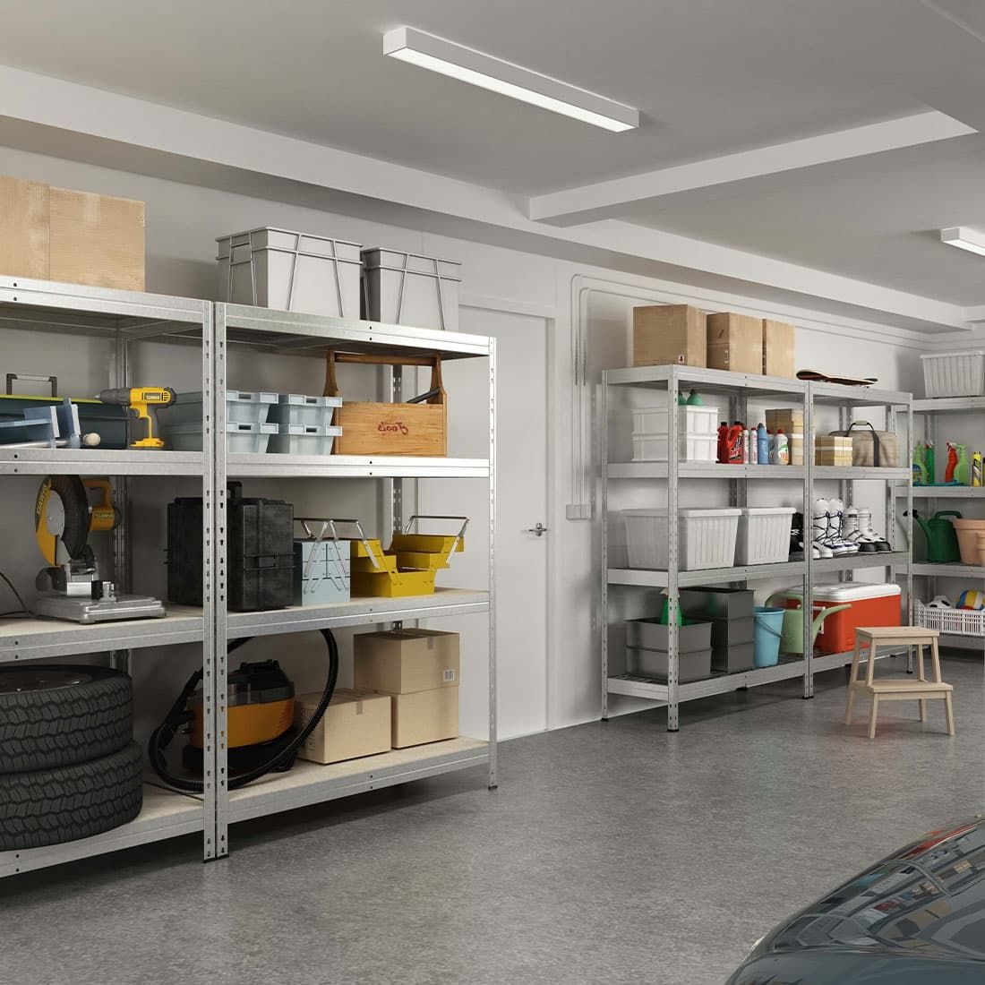 - Werkzeuge und Maschinen: Garagenregale bieten ausreichend Platz für Werkzeuge, Rasenmäher oder Schneefräsen.