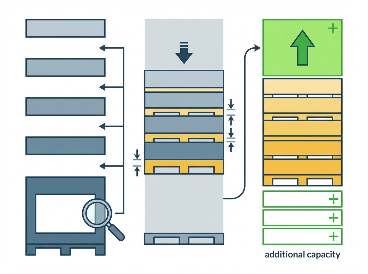 Schon eine Reduktion um wenige Zentimeter pro Ebene kann über das gesamte Lager hinweg mehrere zusätzliche Stellplätze schaffen.