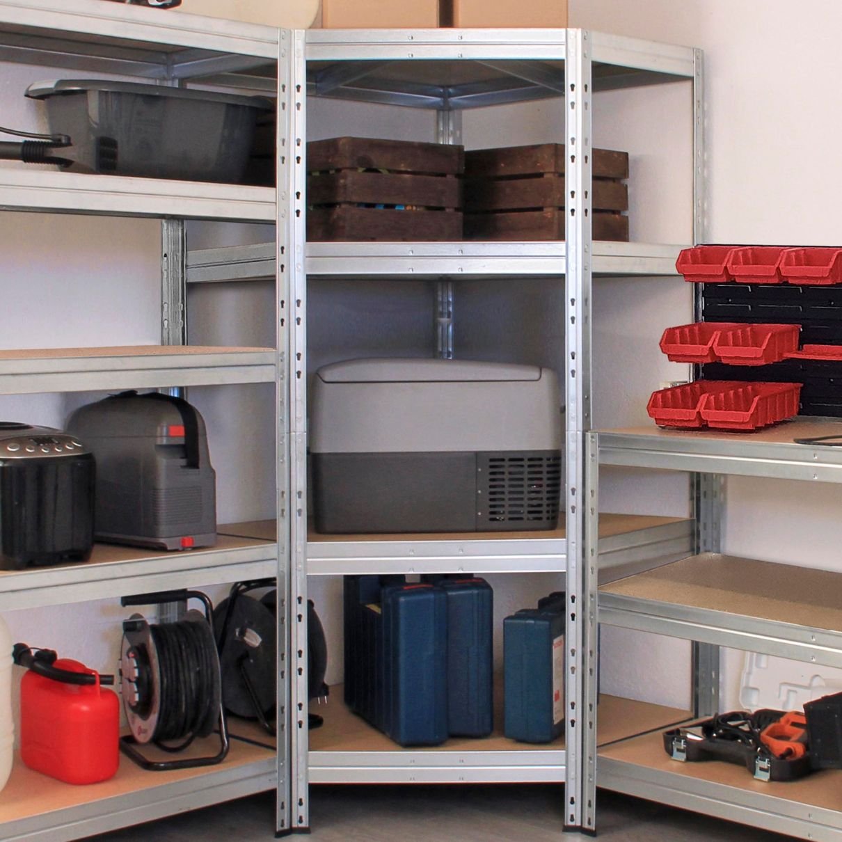 Das Rivet Eckregal mit 5 mm HDF-Böden ist eine kompakte, robuste Lagerlösung zur optimalen Nutzung von 90×90 cm großen Ecken in Garagen, Werkstätten, Kellern oder Hauswirtschaftsräumen