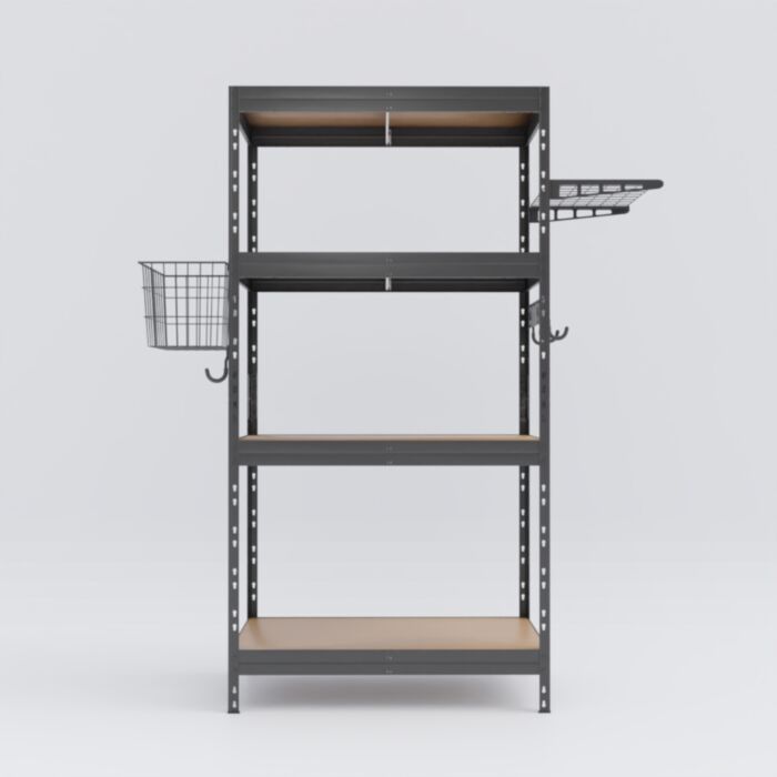 Dazu erhalten Sie praktisches Zubehör für Ihr Schwerlastregal! Es ist die perfekte Ergänzung für unsere Regalsysteme und hilft Ihnen dabei, auch die kleinsten Dinge übersichtlich aufzubewahren. Während an der Hakenleiste Dinge wie Schläuche, Kabel und andere Dinge praktisch am Schwerlastregal aufhängen können, bieten der Aufhängekorb und das Ablagefach zusätzlichen, individuellen Stauraum.
