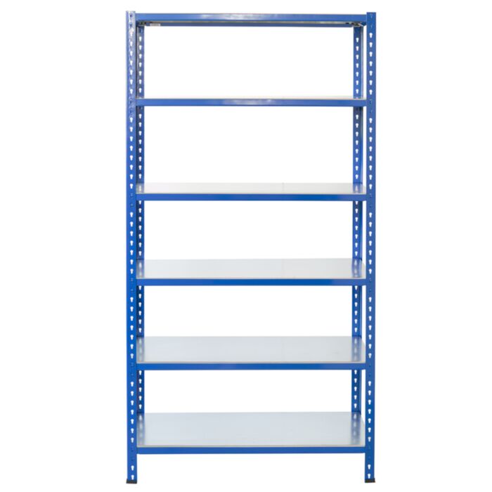 Steckregal aus Metall 200x60x30 mit hoher Tragkraft, robuster und stabiler Konstruktion. Das Regalsystem findet den Einsatz in Lagerraum, Keller, Laden, Haushalt usw. Die einfache und schraubenlose Montage von einzelnen Komponenten kann man in weniger als 15 Minuten schaffen.Jedem Regal ist eine detaillierte Montageanleitung beigelegt. Die Regalmaße betragen (HxBxT): 200x60x30 cm (2000x600x300 mm) Das Steckregal hat eine hohe Tragkraft, 180 kg je Boden. Die Gesamttragkraft beträgt bis zu 1080 kg. Das Steckregal hat eine einzigartige attraktive Farbe - blaue Winkelprofile und Traversen. Die Böden sind verzinkt und widerstandsfähig gegen Korrosion und mechanische Beanspruchung. Es wird empfohlen, das Regalsystem an der Wand zu verschrauben. Lieferumfang: 6 Metallböden 4 Winkelprofile ( Breite 40x40 mm, Stahldichte 1,5 mm) 12 Längs- und Quertraversen ( Breite 30 mm und Dichte 1,2 mm) 4 Plastik-Füße Das Produkt wird sicher in zwei Kartons geliefert, die Böden in Versandkarton und die Winkelprofile in Versandrollen.