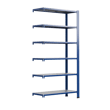 Das Steckregal hat eine hohe Tragkraft, bis zu 180 kg je Boden. Die Gesamttragkraft beträgt 1080 kg. Das Regal ist in einzigartiger Farbe erhältlich, die Winkelprofile und Traversen in Blau und die Böden sind verzinkt. Das Produkt ist widerstandsfähig gegen Korrosion, mechanische Beanspruchung und hat einfache Wartung. Das Steckregal wirkt elegant. Die Lochprofile befinden sich an der inneren Seite der Winkelprofile. Dank seines Designs und Eigenschaften ist das Zusatzmodul für anspruchsvolle Kunden geeignet. Das Regalsystem kann an der Wand verschraubt werden.