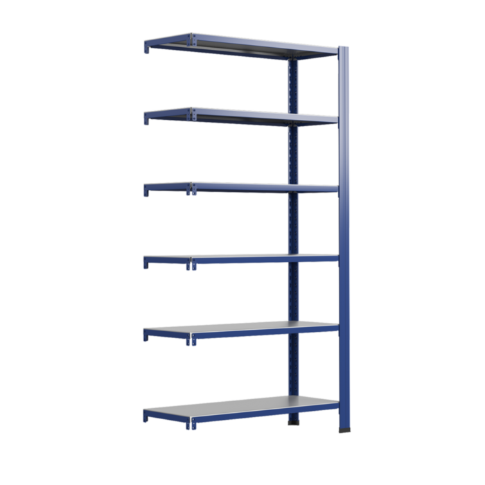 Das Steckregal hat eine hohe Tragkraft, bis zu 180 kg je Boden. Die Gesamttragkraft beträgt 1080 kg. Das Regal ist in einzigartiger Farbe erhältlich, die Winkelprofile und Traversen in Blau und die Böden sind verzinkt. Das Produkt ist widerstandsfähig gegen Korrosion, mechanische Beanspruchung und hat einfache Wartung. Das Steckregal wirkt elegant. Die Lochprofile befinden sich an der inneren Seite der Winkelprofile. Dank seines Designs und Eigenschaften ist das Zusatzmodul für anspruchsvolle Kunden geeignet. Das Regalsystem kann an der Wand verschraubt werden.
